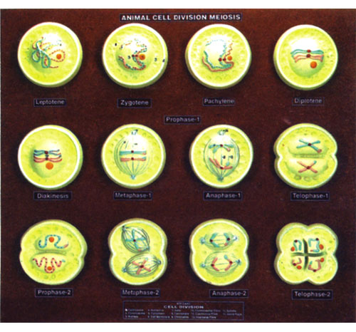 • Set of 12 models, showing detailed stages in meiotic cell division, beautifully colored to bring out the detailed structure as seen under the microscope. Mounted on board.