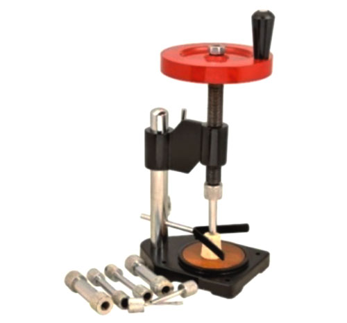 - For drilling uniform and straight holes in cork or rubber stoppers. Cast-iron frame with wood platform 10 cm. diameter to support work and adjustable guide row central hole through wheel spindle for ejector rod and introduction of lubricant (eater of methylated Spirit). Complete with set of 12 nickel-plated borers cutting sizes from 7 to 25 mm.
