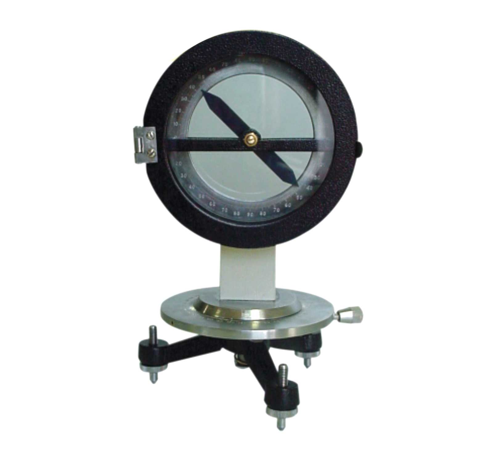 The needle and the scale are housed in a non-magnetic aluminum casing with a glass window, both of which are capable of rotating about a vertical axis on a cast metal base.