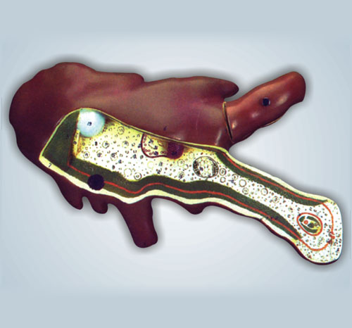 • Amoeba proteus, enlarged approx. 1000 times. In a small pseudopodium which can be opened up showing the structure after electron microscopic magnification. On a base with explanatory notes. Separates into 2 parts. Numbered with English Key Card.