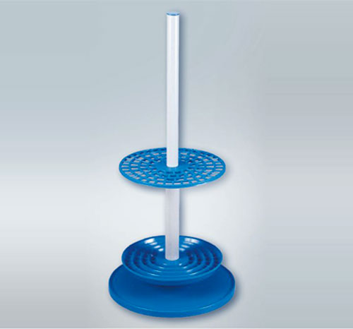 Molded in Polypropylene, this unique Stand holds a maximum of 94 pipettes and rotates on a central vertical axis for convenient selection of any particular pipette. The lower rotating disc has four concentric troughs with tapered sides and open bottoms which cradle the pipette tips protectively and permit water drops to run off. The upper disc has a grid pattern concentric with the bottom disc and keeps the pipettes vertical. Liquids draining off the pipettes are retained on the top of the stationary base by the outer ring. This stand can be easily disassembled & reassembled.