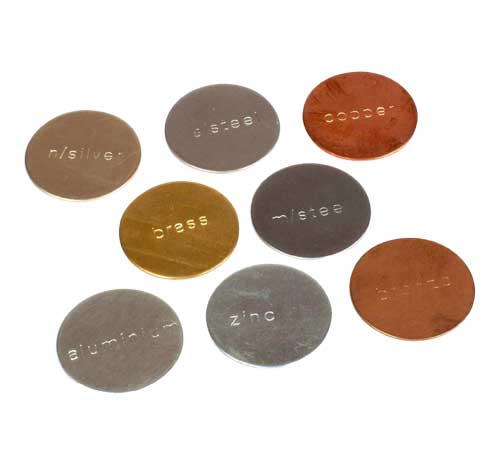 - Set of 16 discs, 2 of each metal. One of each pair is stamped with the name of the metal. The other is unmarked.